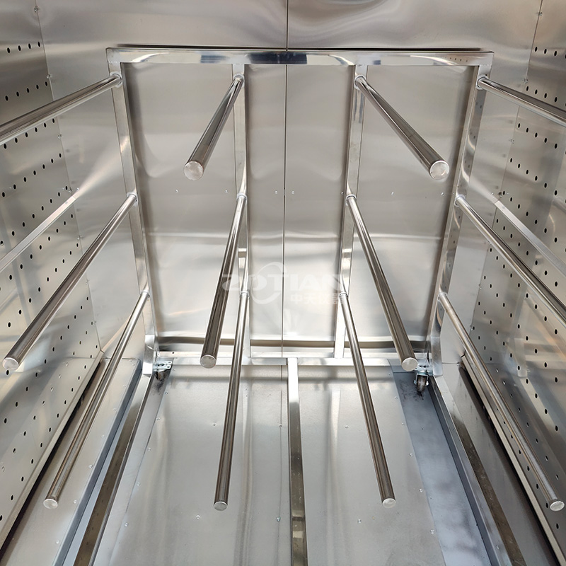 外形采用 1.5mm 厚冷板折彎焊接而成,表面噴電腦白工業(yè)漆(非普通油漆),防生銹,外形尺寸:寬 1600mm,深 830mm,高 1860mm,雙開(kāi)門(mén), 配加強(qiáng)型不銹鋼門(mén)鎖,拉手。底部配可移動(dòng)剎車(chē)腳輪,方便烤箱移動(dòng)固定。